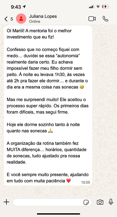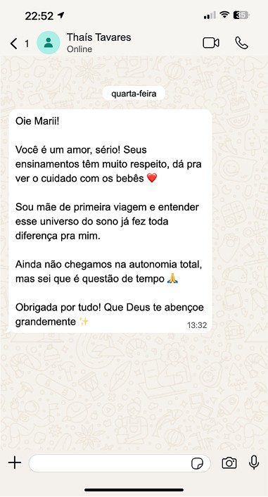 Foi durante a gravidez da minha primeira filha que me apaixonei pelo universo do sono infantil. Desde então, essa se tornou minha missão: caminhar ao lado de mães como você, levando acolhimento, leveza e conhecimento.